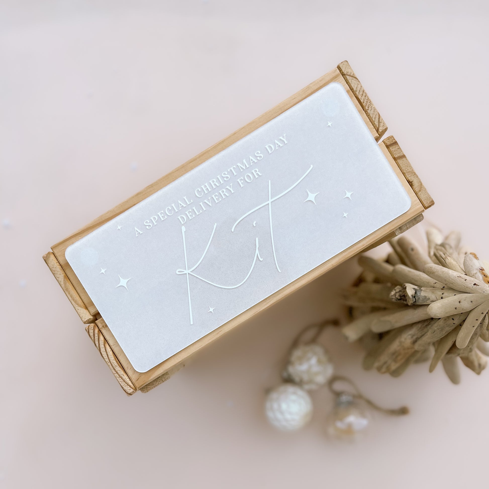 Elevate your Christmas traditions with our charming personalised plaque made for attaching to the front of a crate! Handcrafted with care, this elegant plaque is designed to adorn the front of your Christmas Day crate, adding a touch of personalised magic to your holiday celebrations. Featuring a beautiful timeless design and customisable options, it’s the perfect finishing touch for a crate filled with cozy treats, festive pyjamas, or holiday activities.