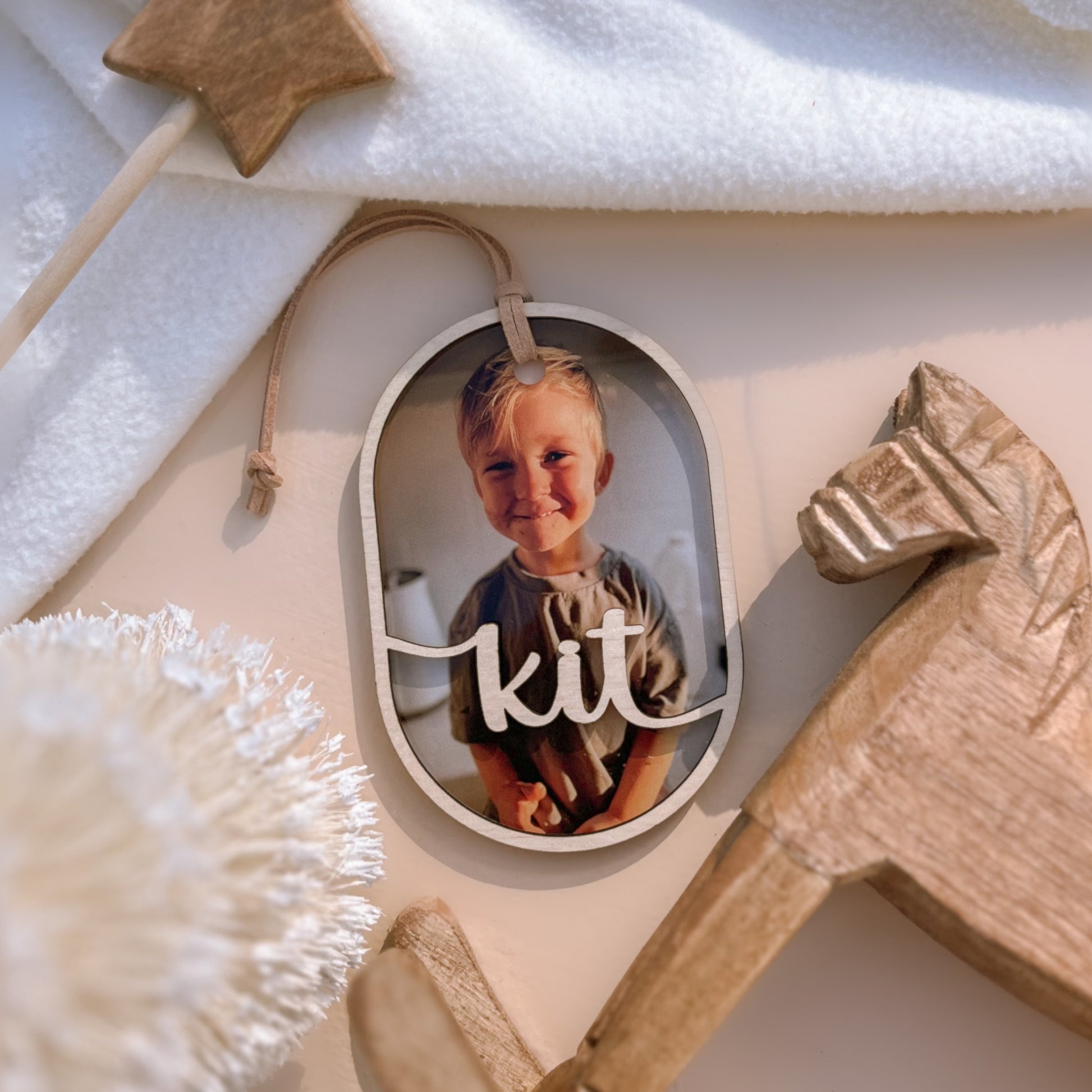 A cherished photo printed on clear acrylic with a natural wooden border, finished with a custom script name or word. A timeless keepsake to celebrate loved ones and create lasting holiday memories.