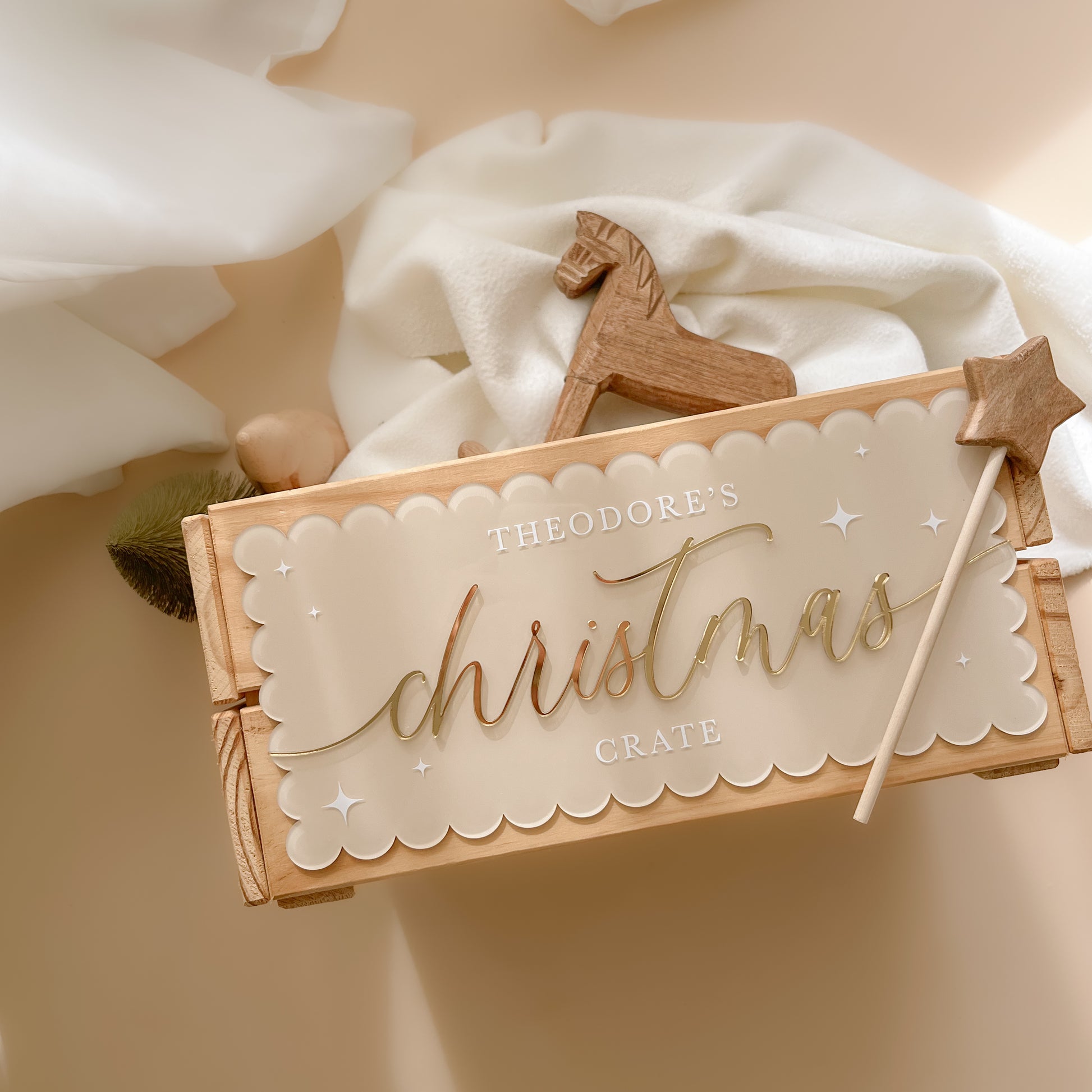 Make your Christmas crate extra special with our handcrafted personalised acrylic plaque, designed to be lovingly attached to the front of your child or family’s festive box. Featuring a scalloped edge and shiny gold mirror Christmas text, it comes in a range of beautiful colours and patterns to suit your style. A magical finishing touch to a treasured holiday tradition.