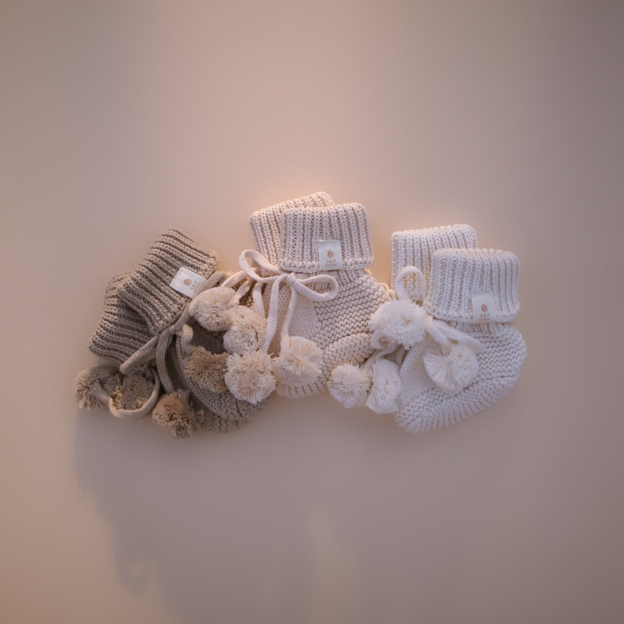 Each pair features a classic knit design, finished with a sweet tie and soft, fluffy pom poms - a charming detail that makes them perfect for first photos, gifting, and special moments. Designed with heirloom quality craftsmanship, these booties are made to be treasured and lovingly passed down through generations.
