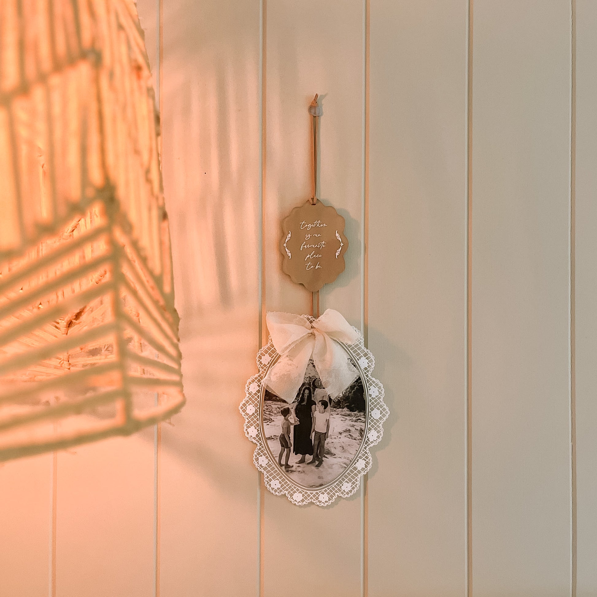 A timeless keepsake made to hold the moments that matter most. Our vintage-inspired photo hanging display features a delicate lace-look frame and a beautifully finished ribbon for an elegant, heirloom feel.