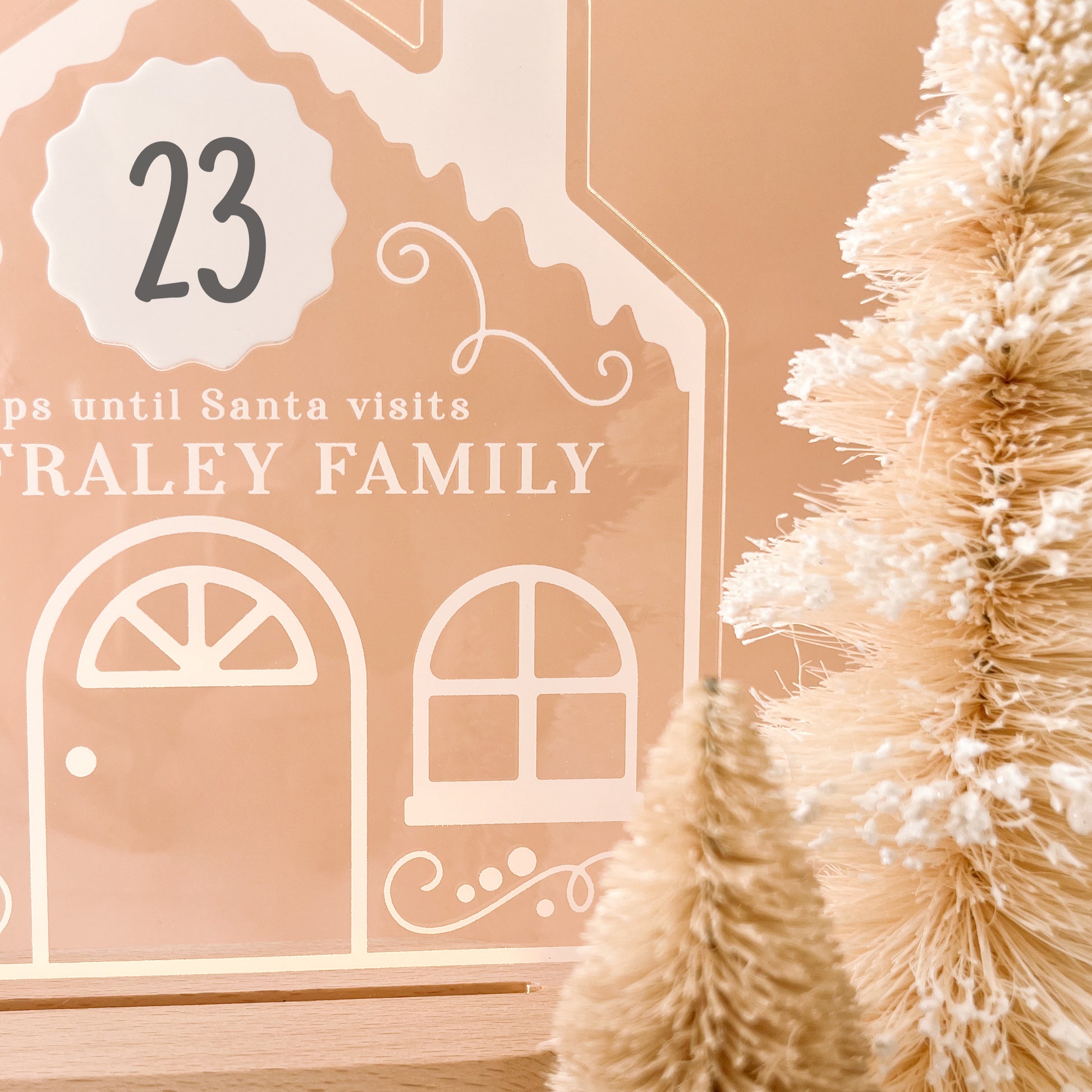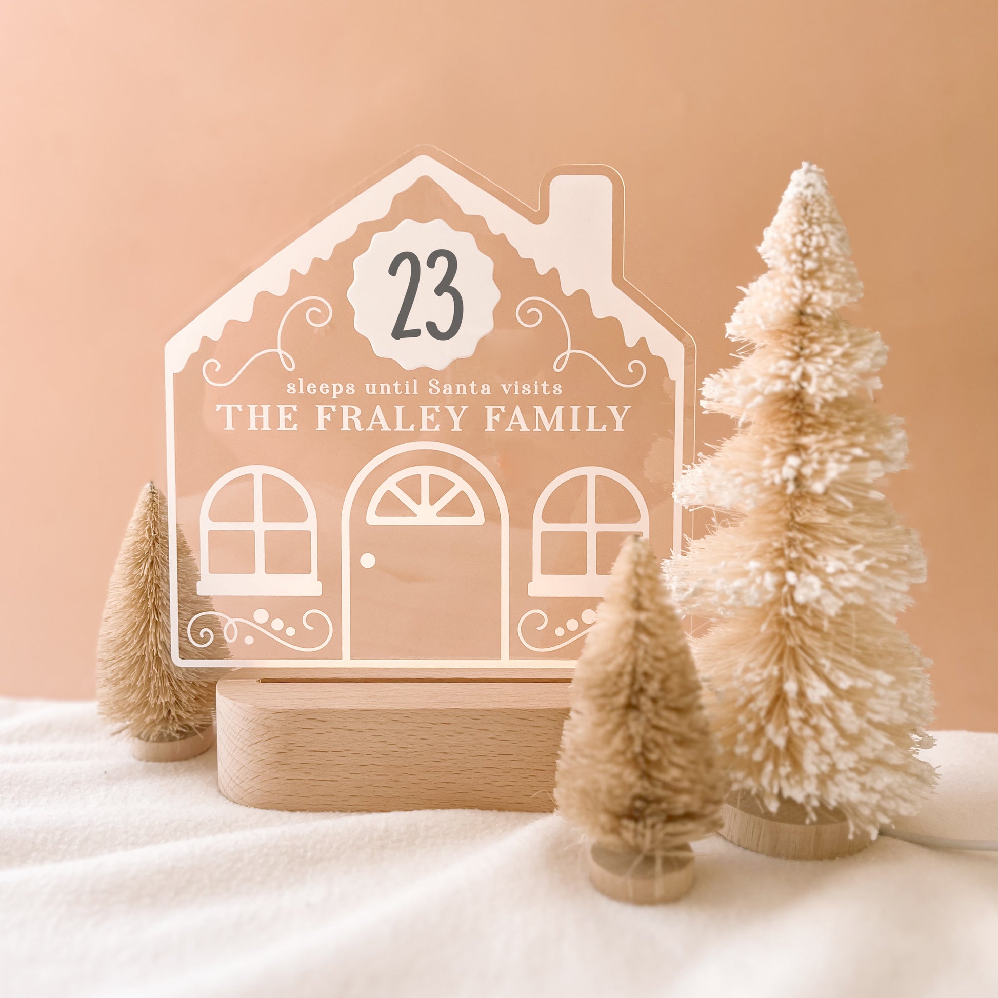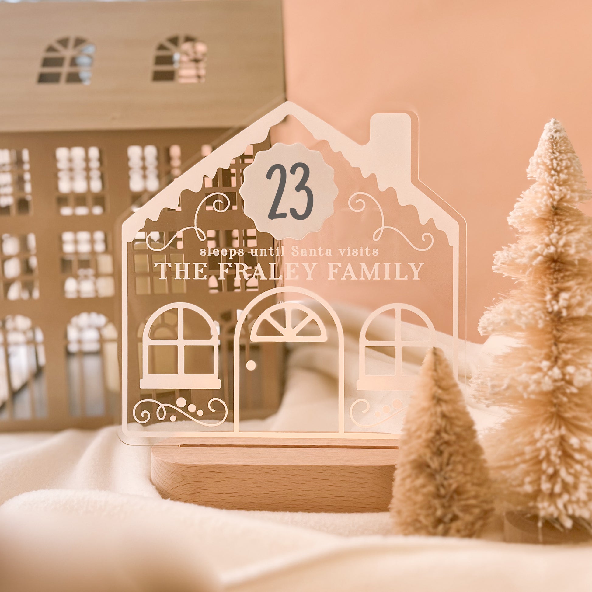 Illuminate the season with our personalised Christmas countdown nightlight. Featuring a charming gingerbread house design on clear acrylic with warm white light, it comes with a free dry erase marker for daily countdown updates. A festive, functional addition to your holiday decor.